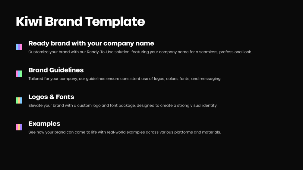 Kiwi's brand identity is a carefully curated expression of innovation and style, designed to captivate and engage while maintaining an approachable and relatable essence. At its core, the brand balances boldness with refinement, presenting a visual experience that is both striking and subtly sophisticated. This duality reflects the company’s commitment to pushing boundaries and exploring new ideas, all while staying grounded in simplicity and clarity. The brand’s design language is intentionally crafted to make a strong impression without overwhelming, ensuring that it resonates with a wide audience who appreciate both creativity and modern design.